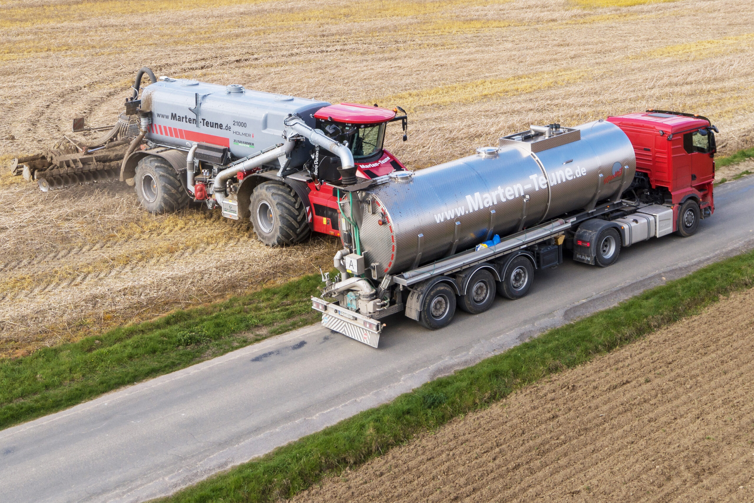 Wir bieten Transportlösungen, die sich am Material und Einsatzort orientieren. Agrartransporte sichern schnelle Feld-zu-Hof-Logistik, beispielsweise für flüssige Wirtschaftsdünger wie Gülle oder Gärreste mit Edelstahl-Tankaufliegern.